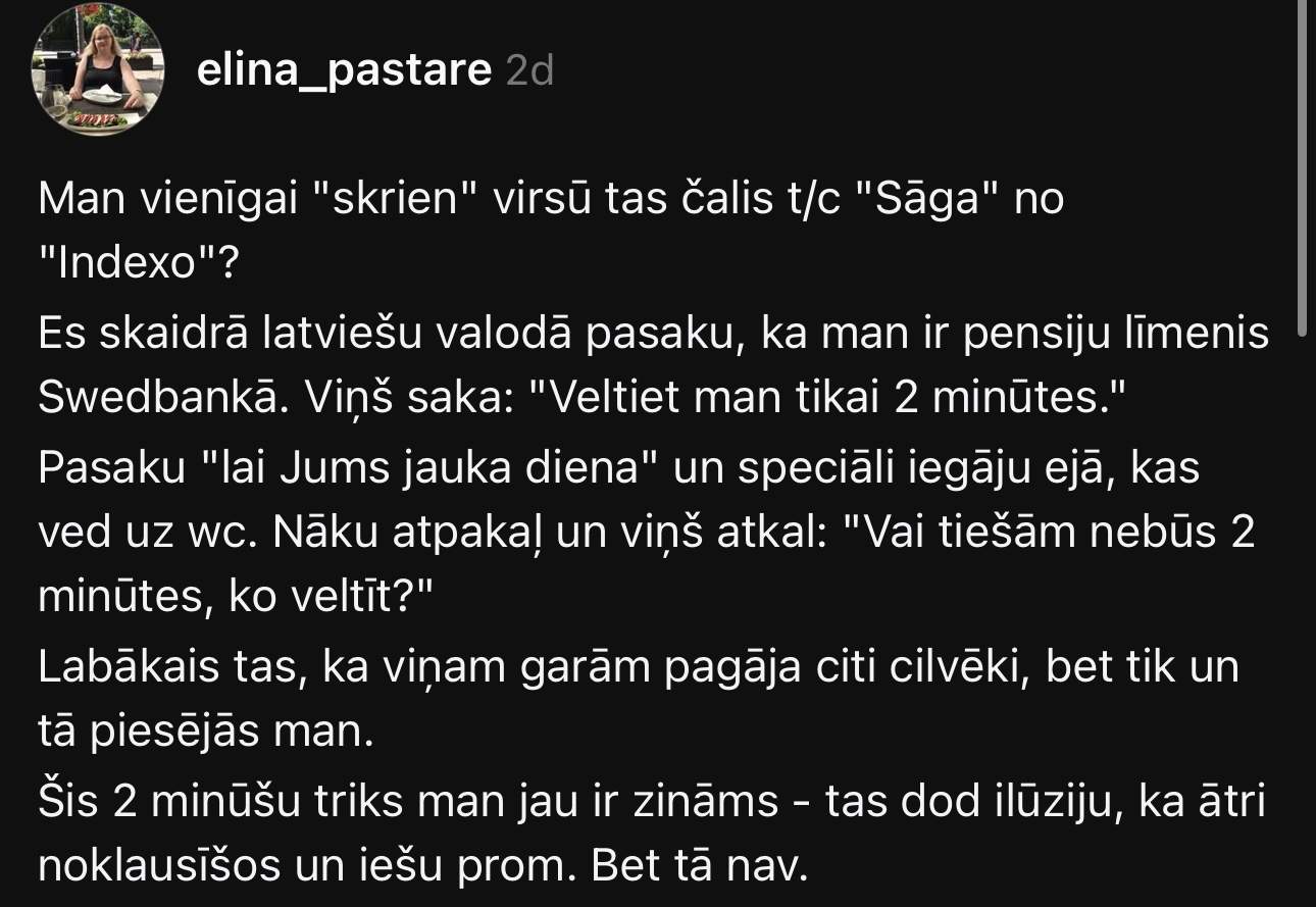 “Man vienīgai “skrien” virsū tas čalis t/c “Sāga” no “Indexo”? Es skaidrā latviešu valodā pasaku, ka man ir pensiju līmenis “Swedbankā”. Viņš saka: “Veltiet man tikai 2 minūtes.” Pasaku: “Lai Jums jauka diena” un speciāli iegāju ejā, kas ved uz tualeti. Nāku atpakaļ, un viņš atkal: “Vai tiešām nebūs 2 minūtes, ko veltīt?” Labākais tas, ka viņam garām pagāja citi cilvēki, bet tik un tā piesējās man. Šis 2 minūšu triks man jau ir zināms – tas dod ilūziju, ka ātri noklausīšos un iešu prom. Bet tā nav,” soctīklā “Threads” dalās Elīna.