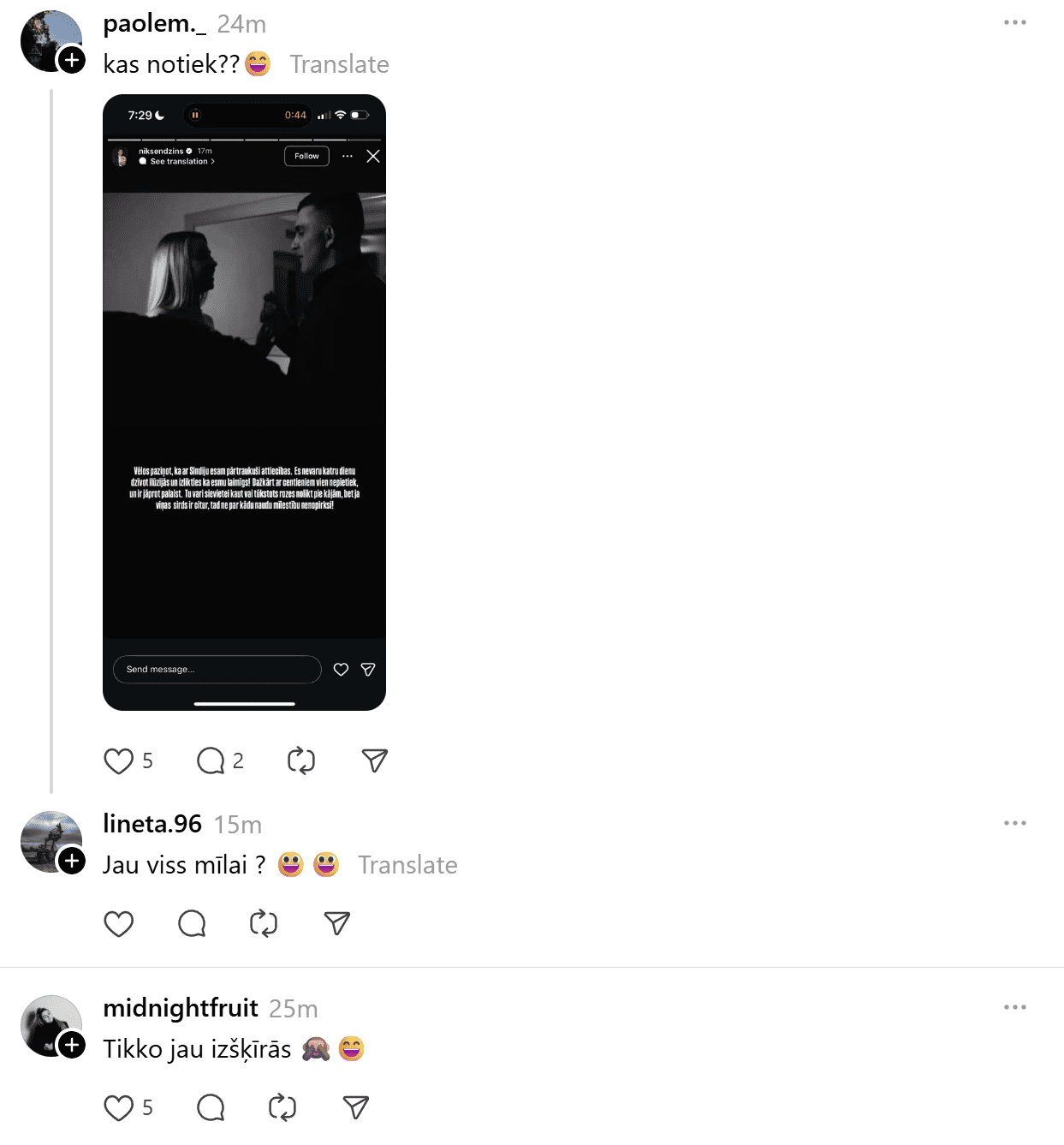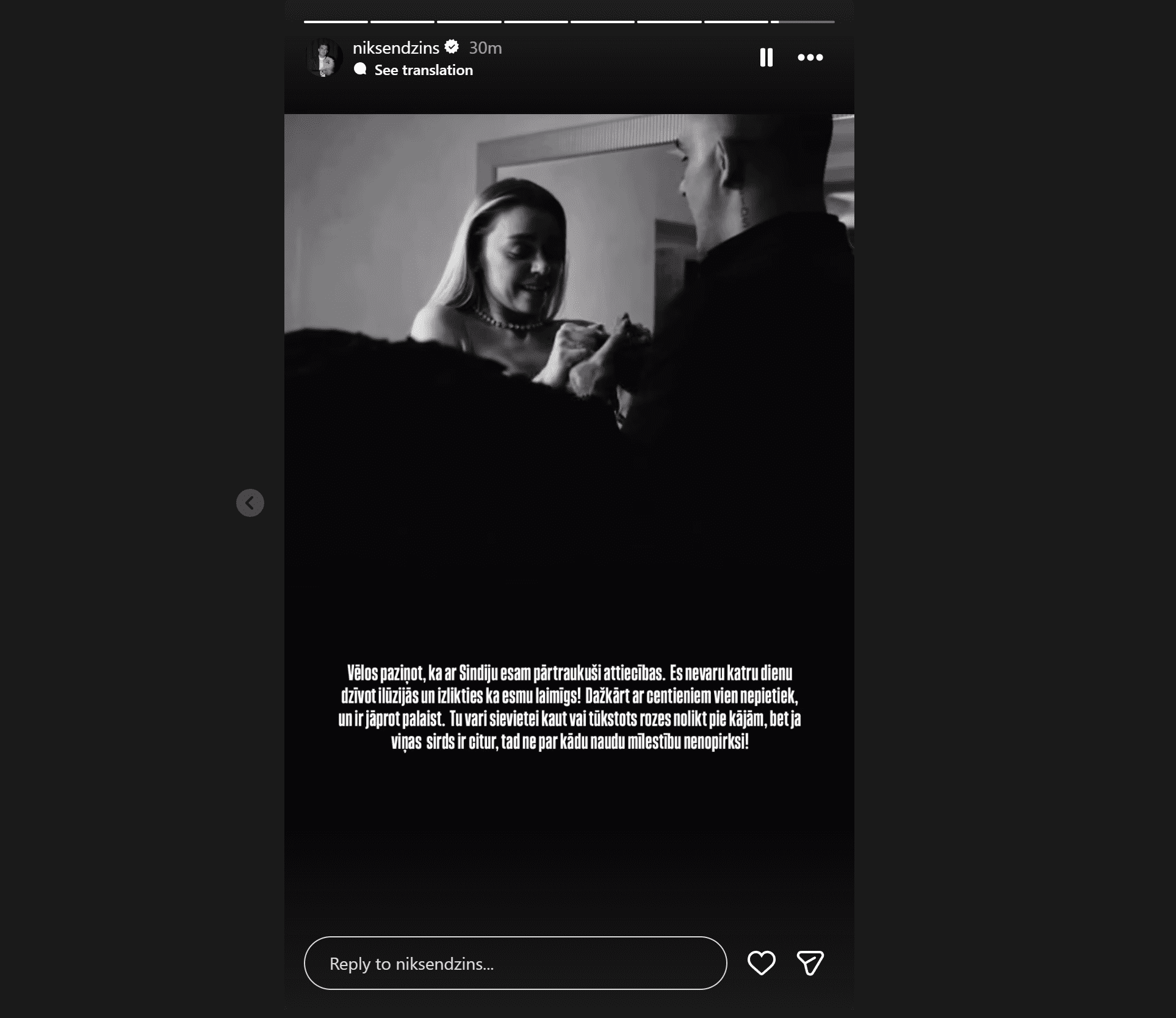 Paziņojums par šķiršanos nācis negaidīti. Vēl pirms pāris stundām savā “Instagram” Endziņš publicēja video ar saderināšanās mirkli, rakstot: “Katra tā dzīves situācija, kas tavā dzīvē notiek, tevi aizved pie kaut kā vērtīga, un manā dzīvē vērtīga esi Tu!”