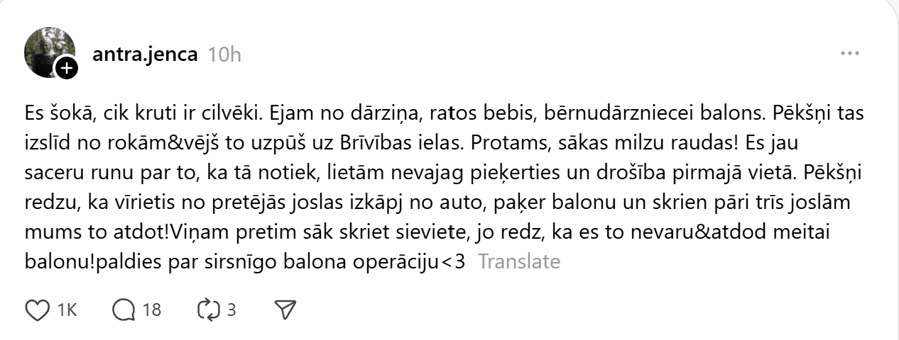 Viņa raksta: “Es šokā, cik kruti ir cilvēki. Ejam no dārziņa, ratos bebis, bērnudārzniecei balons. Pēkšņi tas izslīd no rokām un vējš to uzpūš uz Brīvības ielas.