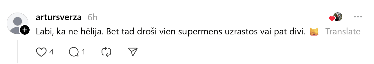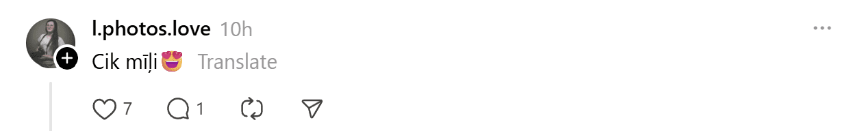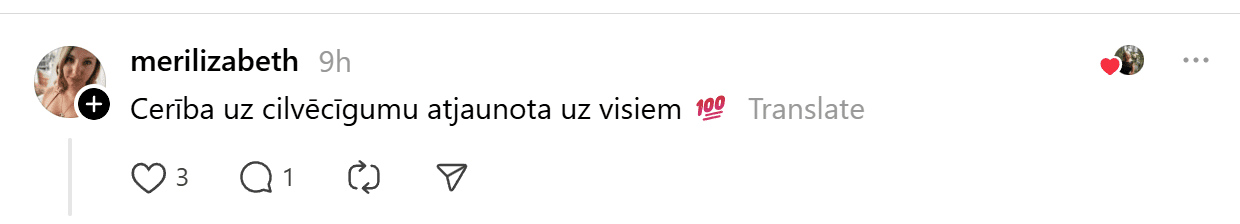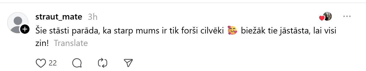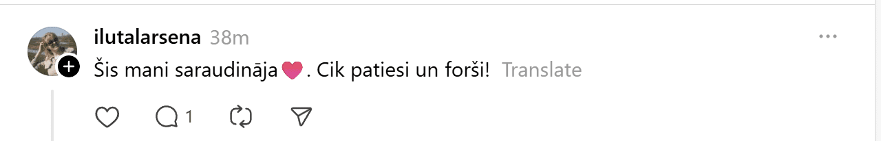 Ierakstu novērtējuši jau tūkstoš “Threads” lietotāju, un cilvēki komentāros priecājas līdz ar ieraksta autori.