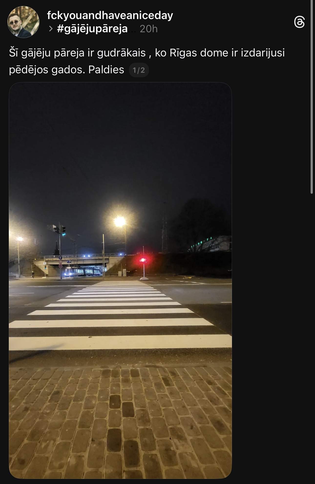 Dīns (Dean) raksta: “Šī gājēju pāreja ir gudrākais, ko Rīgas dome ir izdarījusi pēdējos gados. Paldies.”
