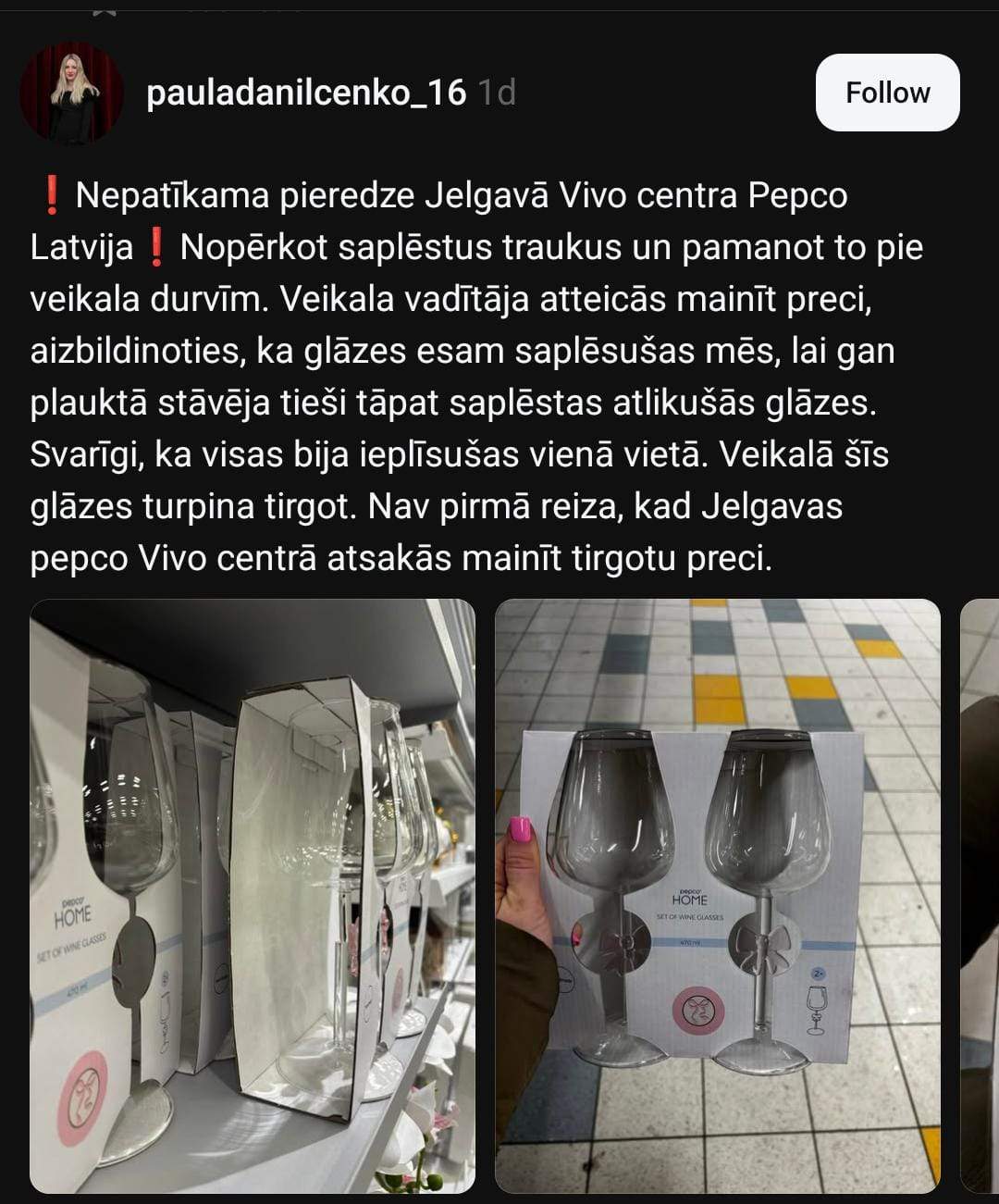 Veikalā šīs glāzes joprojām tiek tirgotas. Tā nav pirmā reize, kad Jelgavas “Pepco” veikalā atsakās mainīt bojātu preci,” raksta Paula.