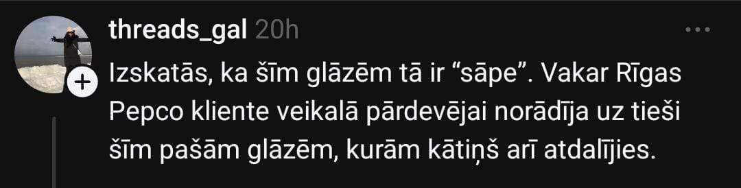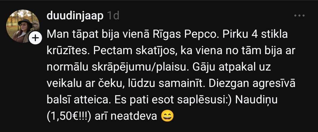 Piemēram, Sabīne norāda, ka viņai ar šo veikalu bijusi pozitīva pieredze: “Nesen pirku glāzes vienā no Rīgas “Pepco” veikaliem. Man bija laba pieredze. Pirkšanas brīdī kasiere atvēra vaļā kastīti un pārbaudīja, vai viss ir kārtībā ar glāzēm.”