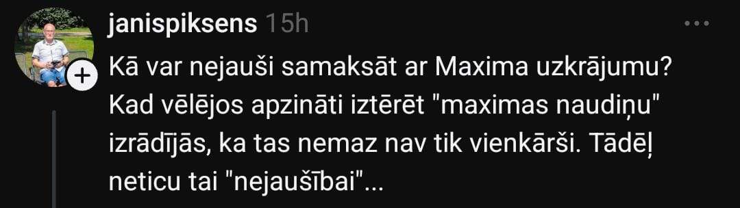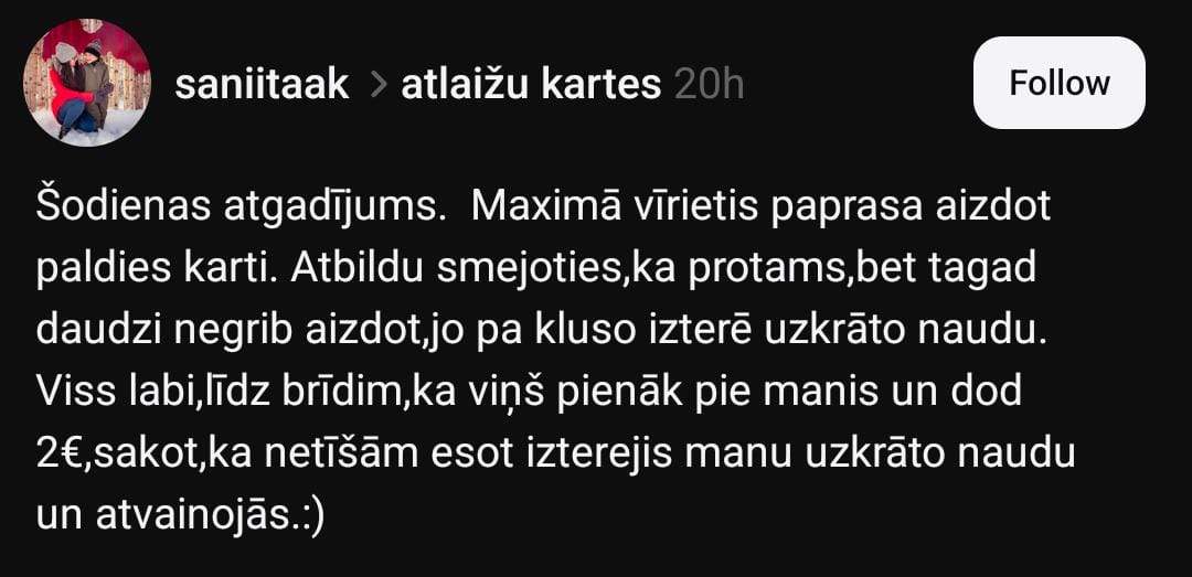 Sanita sociālo mediju platformā “Threads” uzsāk diskusiju par šo tēmu: “Šodienas atgadījums. “Maximā” vīrietis palūdza aizdot “Paldies” karti. Atbildēju smejoties, ka protams, bet tagad daudzi negrib aizdot, jo pa kluso iztērē uzkrāto naudu.
