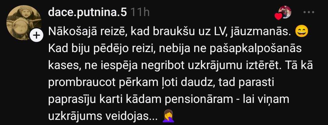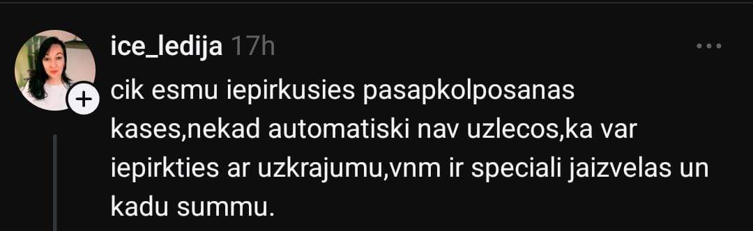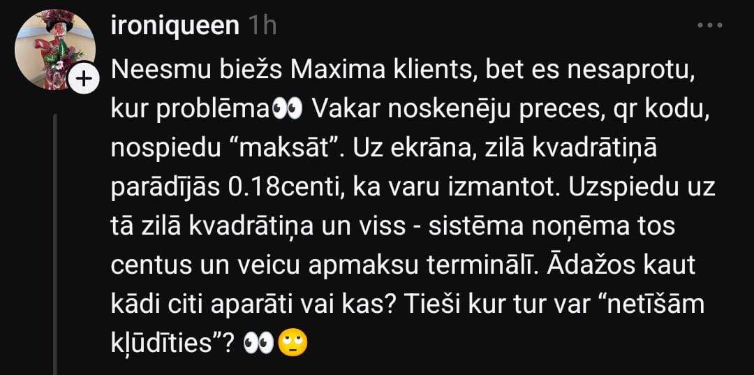Arī Marta dalās pieredzē: “Vispār es “Maximā” ļoti reti eju un joprojām neesmu sapratusi, kā pie pašapkalpošanās kasēm var samaksāt, kamēr nav nospiesta poga par uzkrājuma izmantošanu. Rimi ir citādāk – tur atsevišķi jāizvēlas maksāt ar uzkrājumu. Tāpēc saprotu, ka var netīšām svešam cilvēkam iztērēt.”
