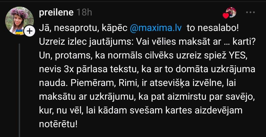 Kristīne piekrīt: “Kad noskenē karti, uzreiz parādās lodziņš ar jautājumu – vai vēlaties maksāt ar paldies karti. Ātrumā izlasot tikai sākumu, cilvēks automātiski nospiež “jā”, domājot, ka maksās par pirkumu. Tas attiecas uz steidzīgajiem, nevis uz bezkaunīgajiem.”