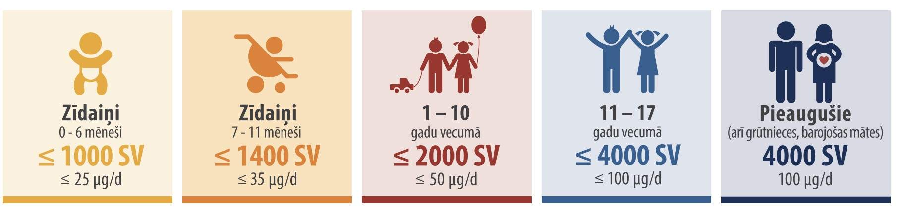Kā izvēlēties atbilstošo D vitamīna daudzumu? Ja nav laika vai iespēju noteikt savu D vitamīna līmeni, nododot analīzes, nepieciešams izvēlēties savu un ģimenes locekļu profilaktisko D vitamīna devu pašiem. EFSA (Eiropas Pārtikas nekaitīguma iestāde) dažādām vecuma grupām ir noteikusi maksimālās nekaitīgās profilaktiskās D3 vitamīna diennakts devas.
