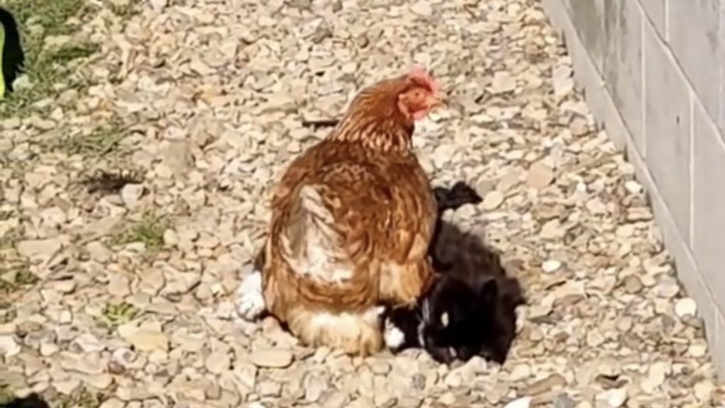 Video redzams mierīgi guļošs kaķis, kas izstiepies pagalmā, baudot saulaino dienu. Tomēr viņa mieru izjauc kāda vista, kas uzrāpjas kaķim virsū, it kā tieši šī būtu piemērotākā vieta olu dēšanai.