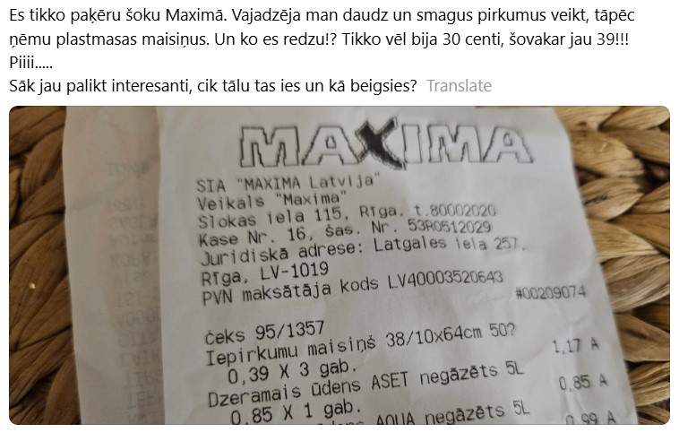 Soctīklā “Threads” kāda pircēja raksta: “Es tikko paķēru šoku Maximā. Vajadzēja man daudz un smagus pirkumus veikt, tāpēc ņēmu plastmasas maisiņus. Un ko es redzu!? Tikko vēl bija 30 centi, šovakar jau 39!!! Piiii….. Sāk jau palikt interesanti, cik tālu tas ies un kā beigsies?”