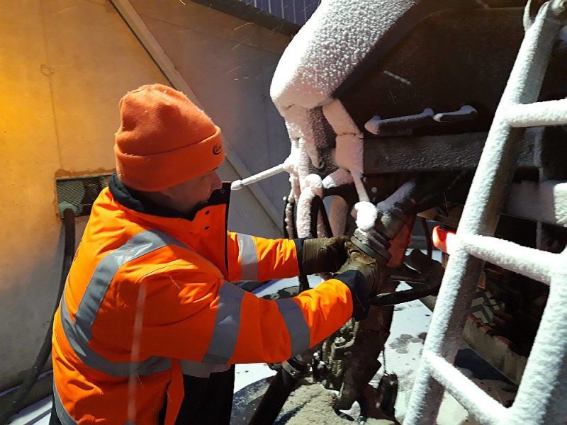 Kabīnes radio sāk skanēt Latvijas himna, pulkstenis ir seši, un Mareks paziņo, ka lielākā maršruta daļa jau ir notīrīta. Vēl kāda pusstunda, un būsim atpakaļ bāzē. Uz ceļiem kļūst arvien blīvāka satiksme – braukt var droši, neslīd.