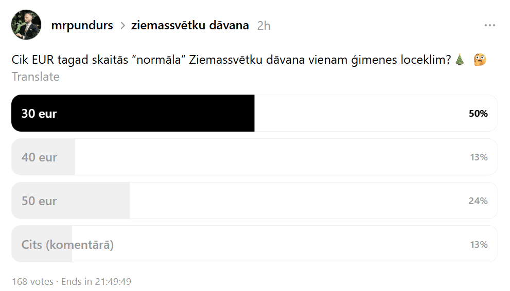 Kā redzams, līdz šim brīdim aptaujā piedalījušies 168 “Threads” lietotāji. No tiem 50% nobalsojuši par 30 eiro vēru dāvanu, 24% nobalsoja par 50 eiro vērtu dāvanu, 13% – par 40 eiro vērtu dāvanu.