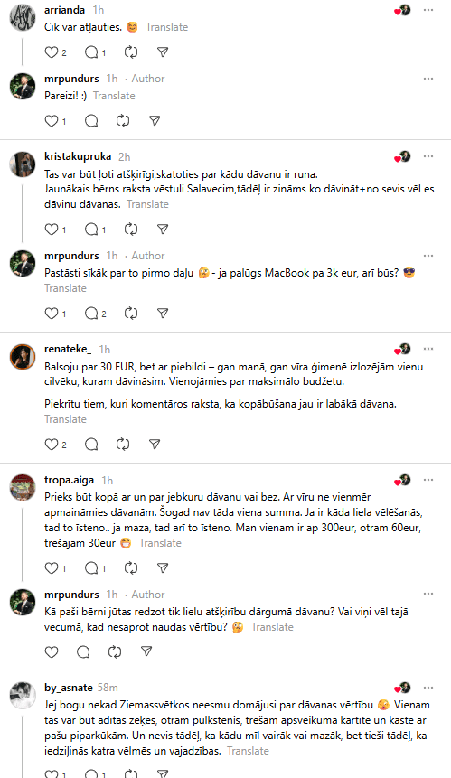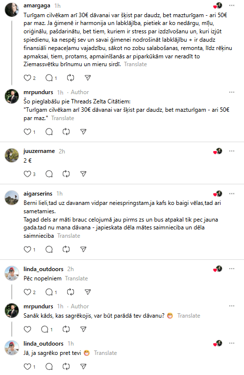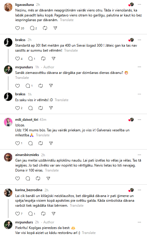 Ir cilvēki, kas norāda, ka katram var atšķirties redzējums uz to, cik nepieciešams tērēt “normālai” dāvanai. Kāda “Threads” lietotāja raksta: “Turīgam cilvēkam arī 30 eiro dāvanai var šķist par daudz, bet mazturīgam – arī 50 eiro par maz.”