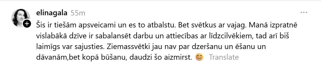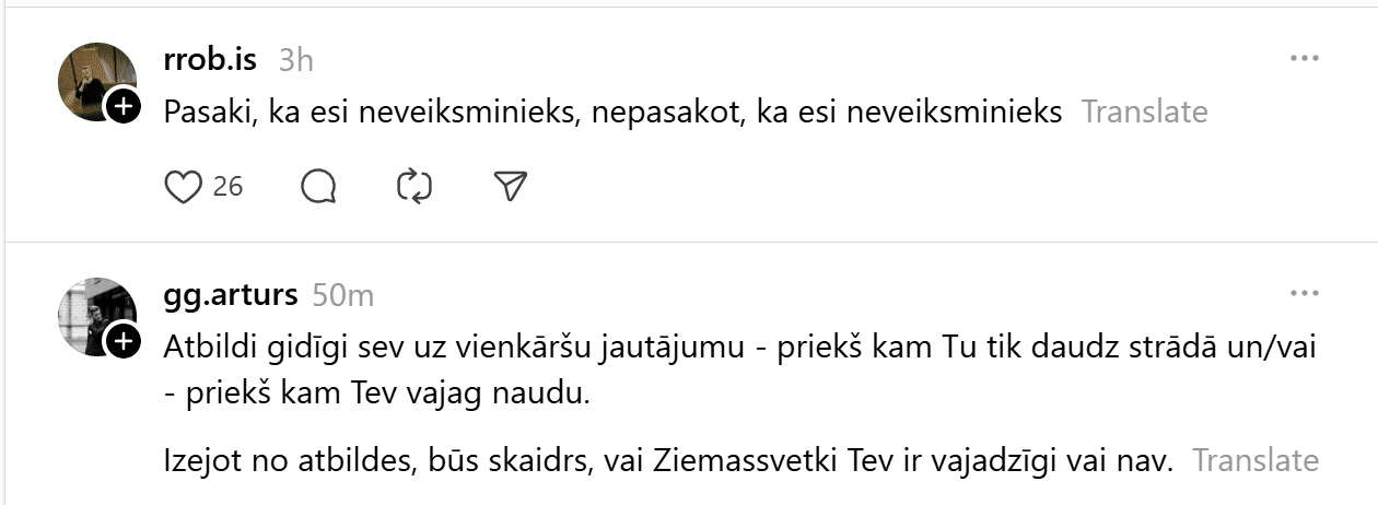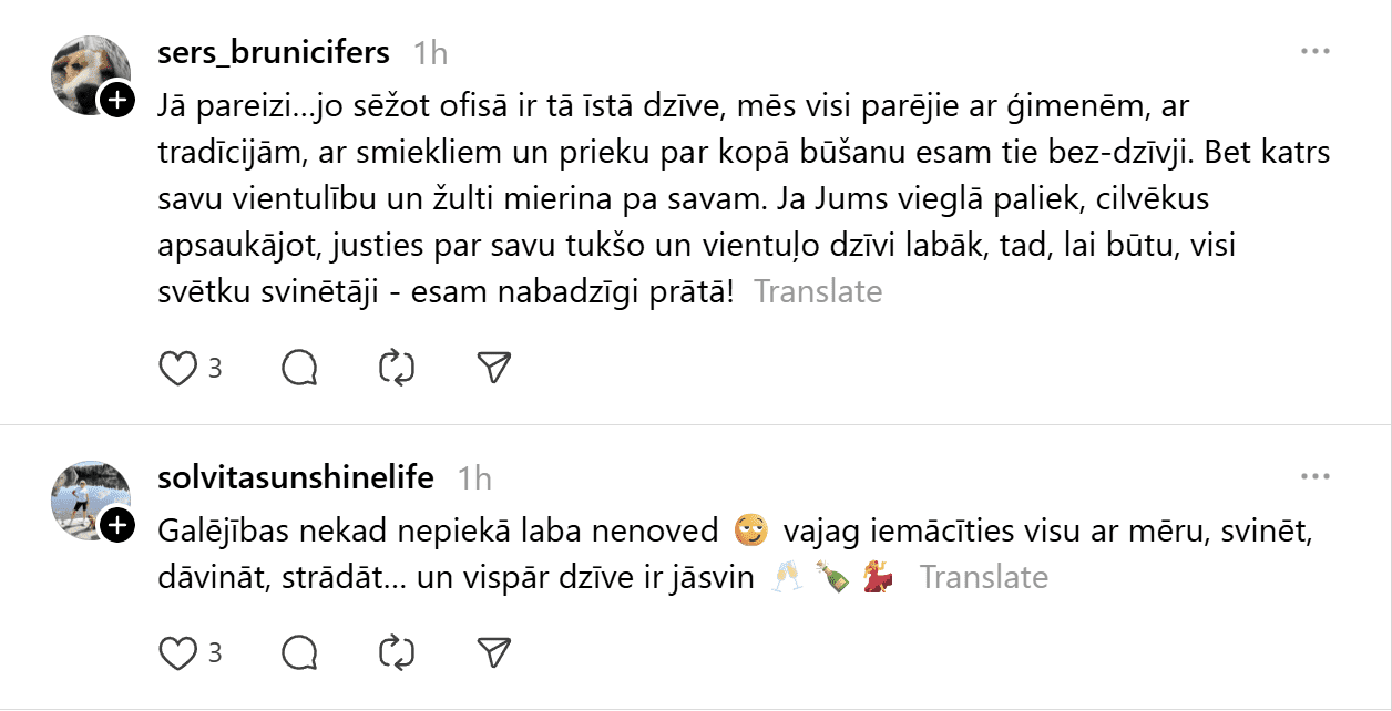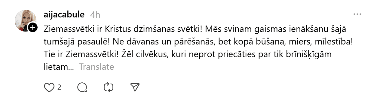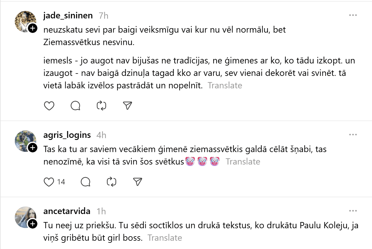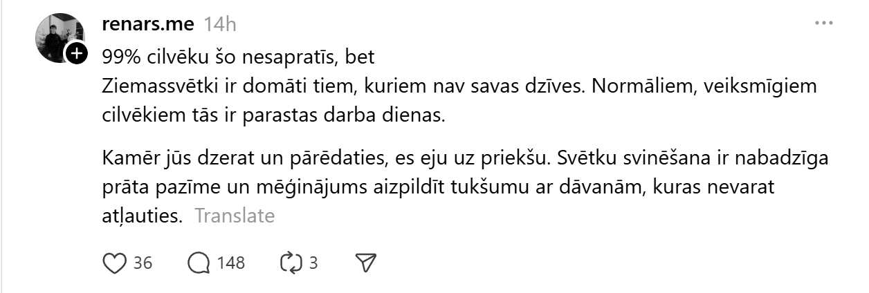 Sociālajā tīklā “Threads” kāds vīrietis publicējis visai provokatīvu ierakstu, kas piesaistījis lielu sabiedrības uzmanību un izraisījis asas diskusijas. Vīrietis raksta: “99% cilvēku šo nesapratīs, bet Ziemassvētki ir domāti tiem, kuriem nav savas dzīves. Normāliem, veiksmīgiem cilvēkiem tās ir parastas darba dienas. Kamēr jūs dzerat un pārēdaties, es eju uz priekšu. Svētku svinēšana ir nabadzīga prāta pazīme un mēģinājums aizpildīt tukšumu ar dāvanām, kuras nevarat atļauties.”
